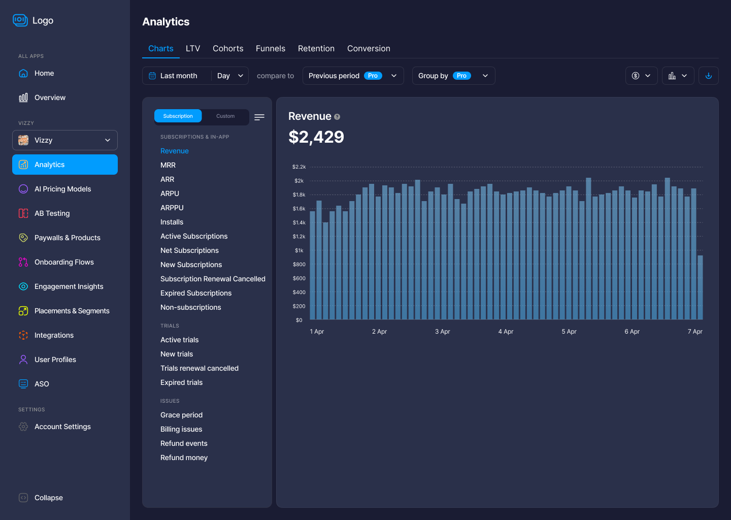 The Revenue chart provides a comprehensive view of the total revenue earned from both subscriptions and one-time purchases, after accounting for any refunds. This visualization is essential for monitoring the financial health of your app and understanding its revenue streams over time.